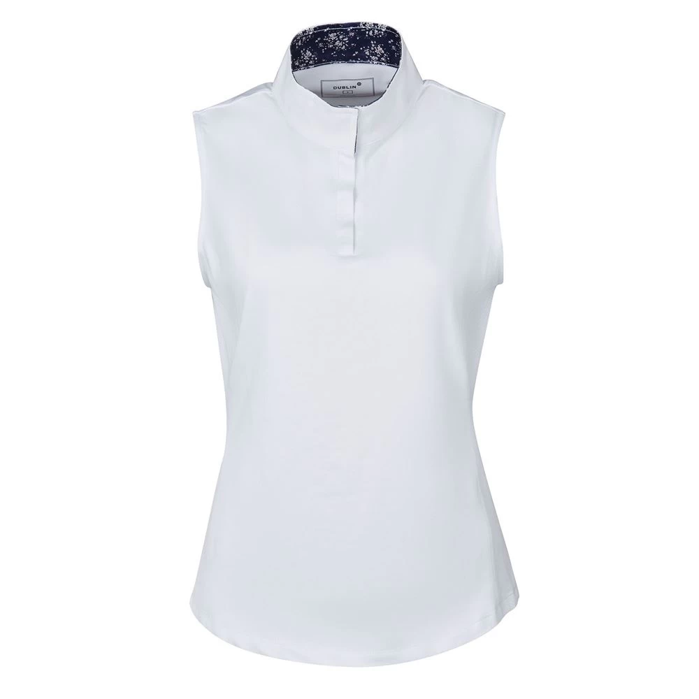 The Dublin Ladies Ria Sleeveless Competition Shirt also features a slim fit, stretch woven collar and cuff with inner print fabric and mesh airflow side panels.