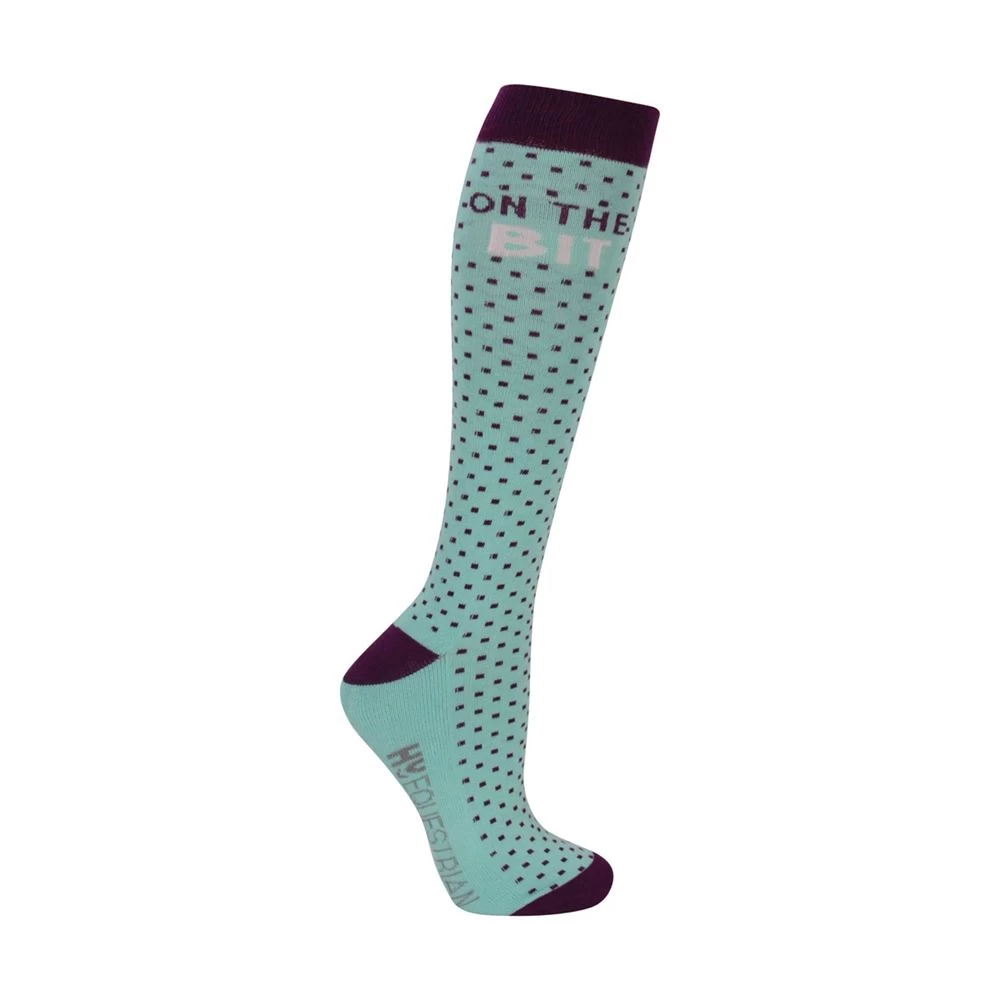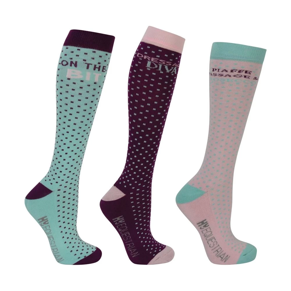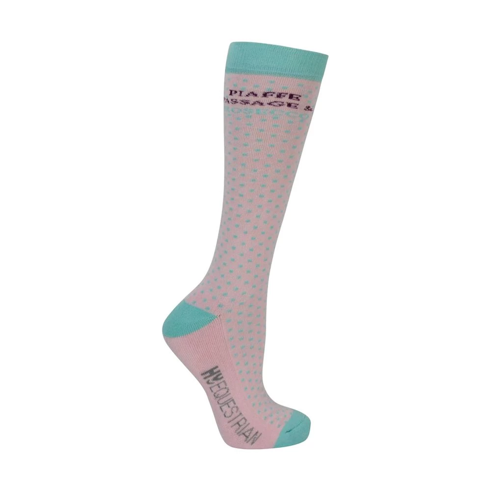 Three Hy Equestrian Dressage Socks featuring a spotty pattern with three fun slogans at the top of the leg – ‘piaffe, passage & prosecco’, ‘dressage diva’ and ‘on the bit’.