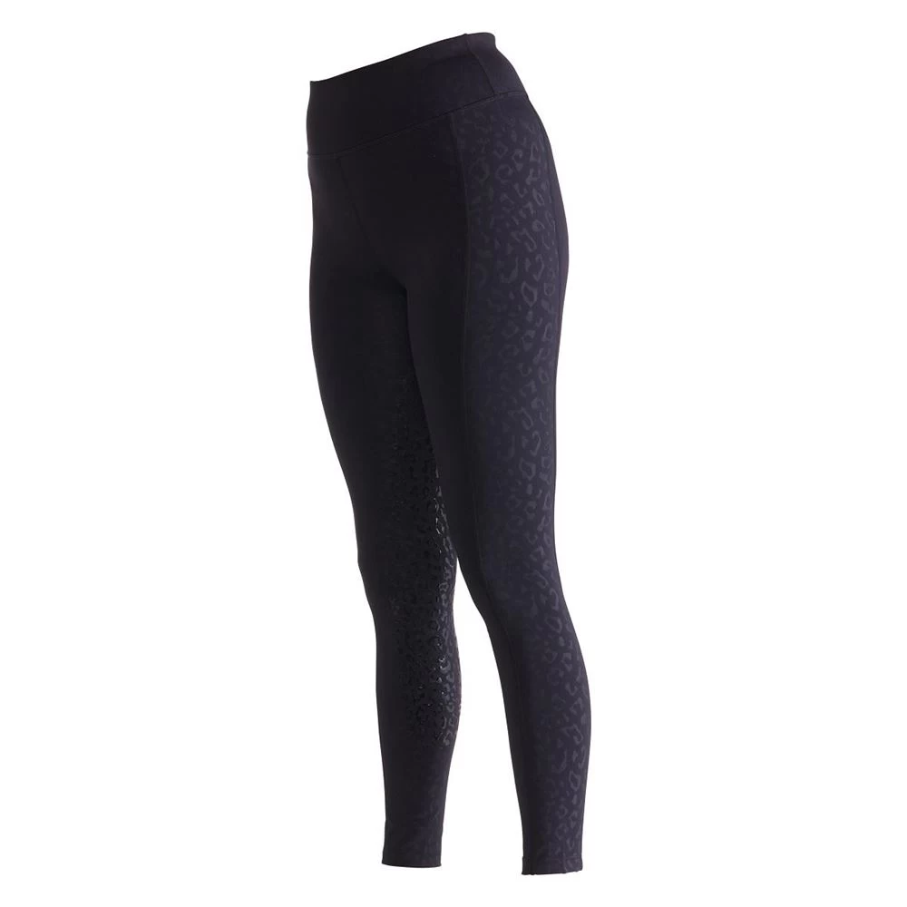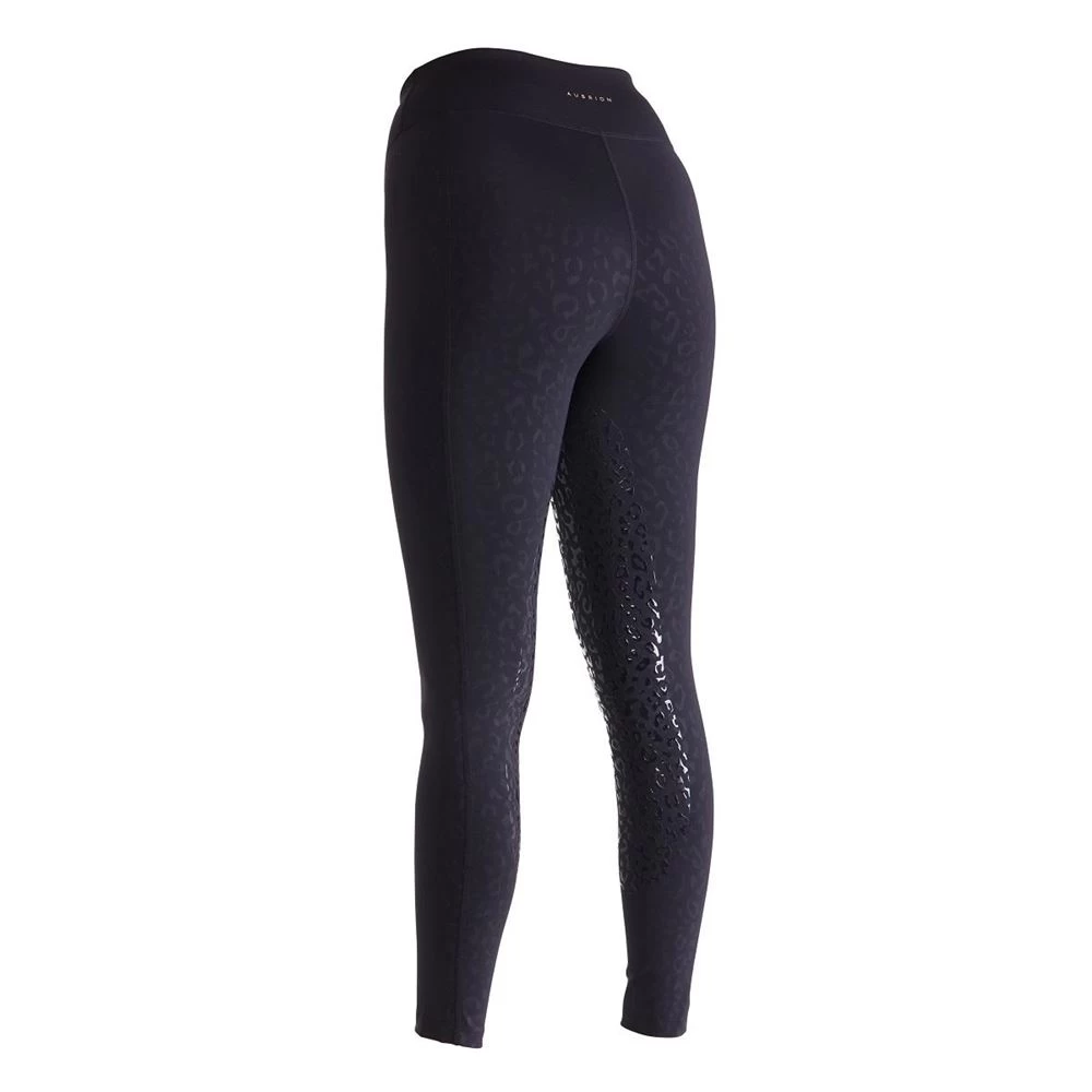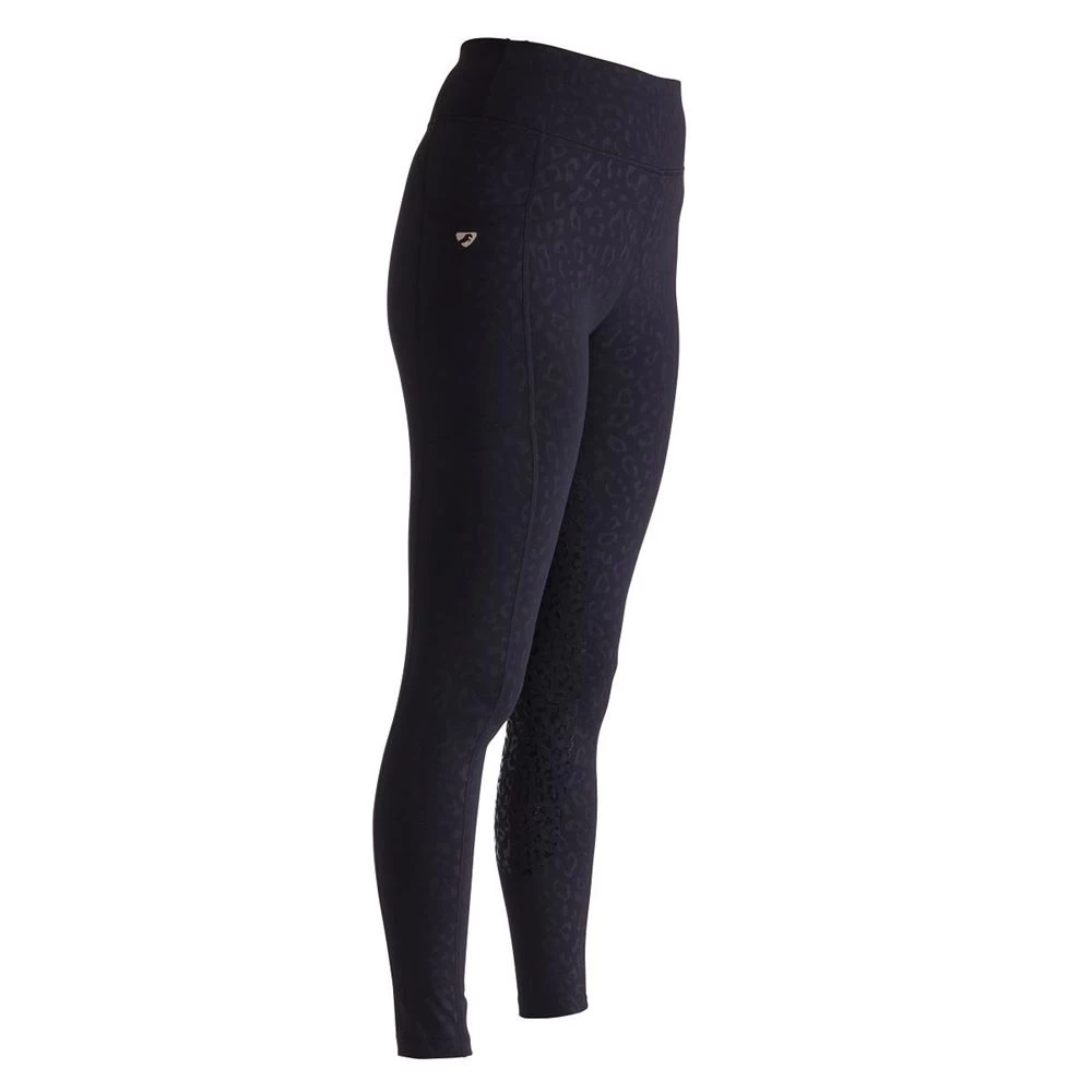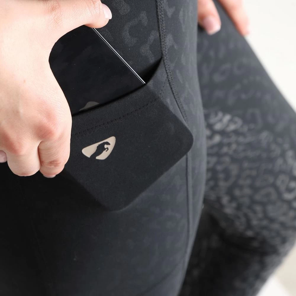 The Aubrion Non-Stop Riding Tights feature a subtle embossed leopard print, fluid second skin feel, silicone leg grips for in saddle security, deep supportive waistband, moisture management stretch fabric, thigh phone pocket, comfort seams and Aubrion prints.