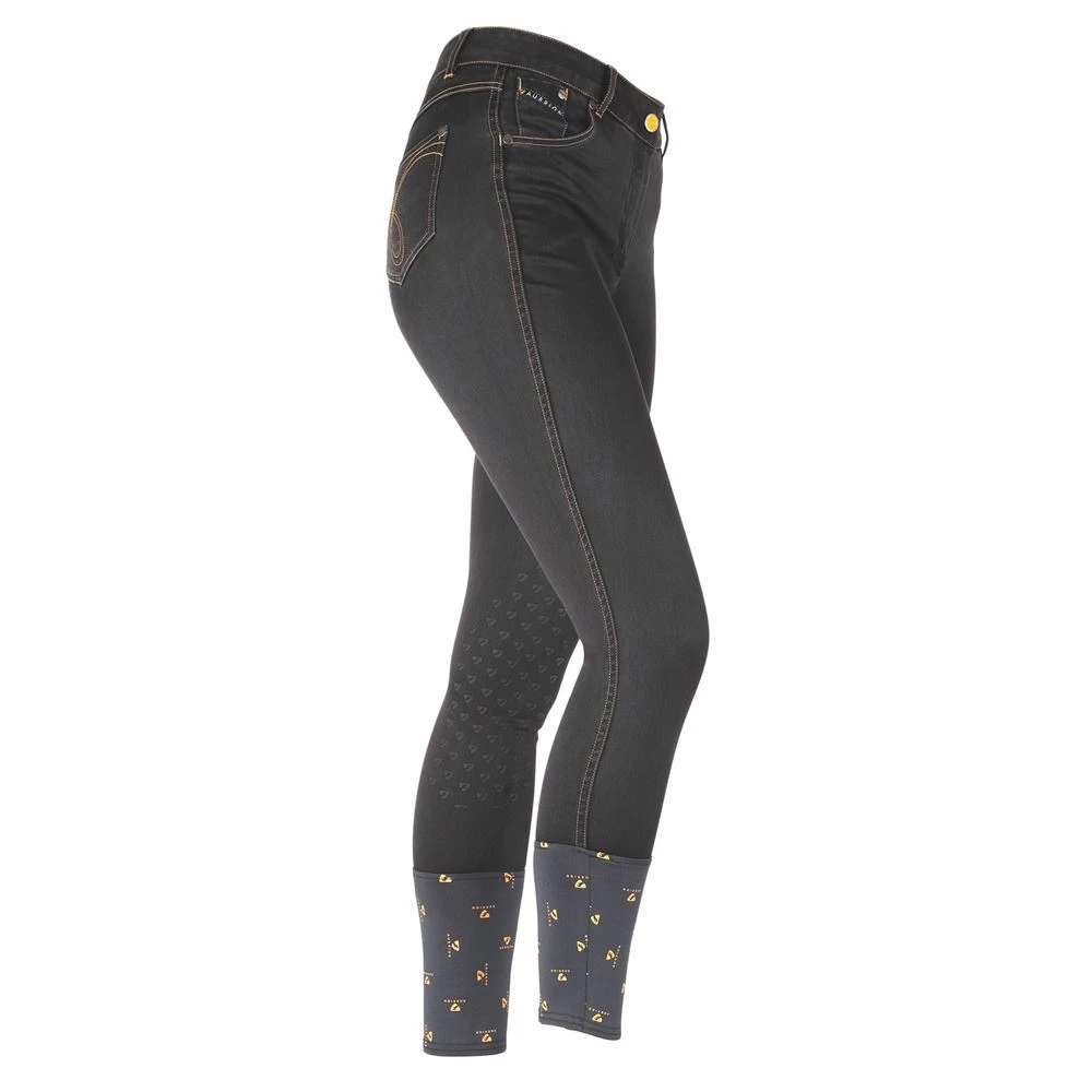 These jean-style, mid-rise Aubrion Putney Denim Breeches come in stretchy washed denim fabric and have jean pocket styling, belt loops, zip fly with enamel button fastener, matte silicone knee grips, sleek dry cuffs and leather look Aubrion emblems.