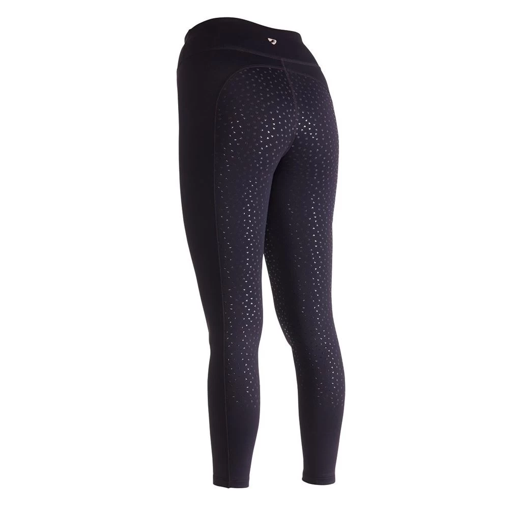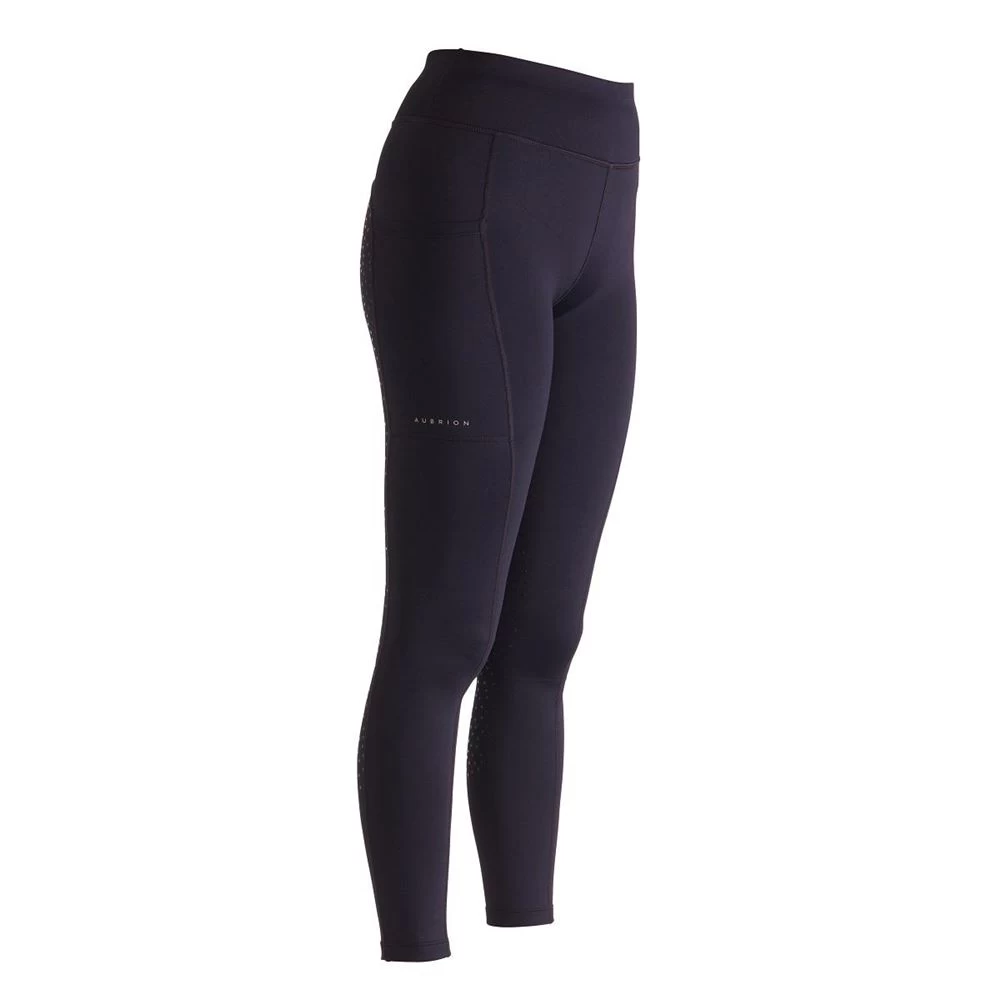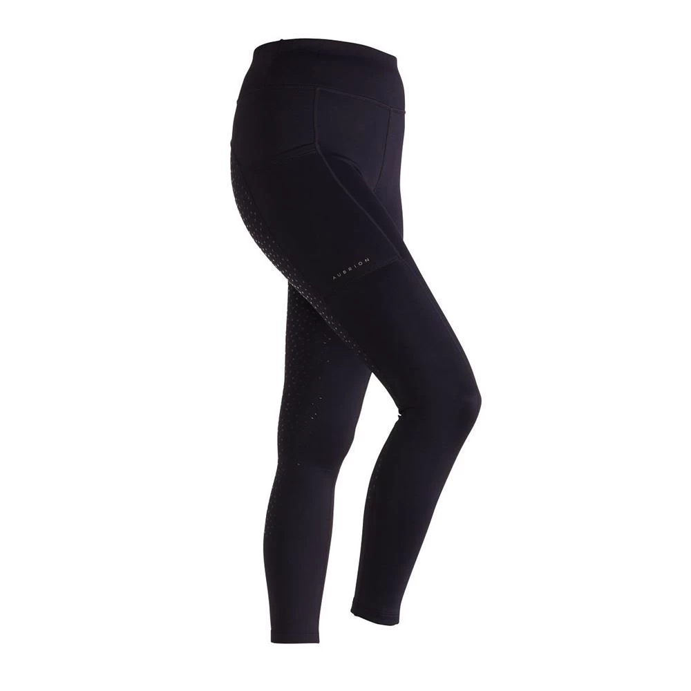 The Aubrion Shield Winter Riding Tights feature a smooth outer, thermal fleecy inner, high waist fit, full seat and leg silicone grips, contour seat, moisture management, thigh phone pocket, comfort seams and Aubrion prints.