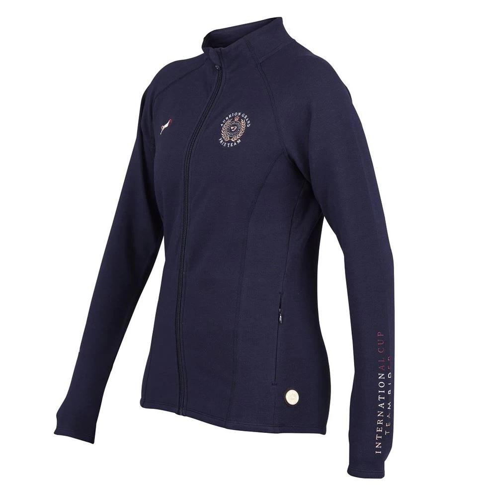 The Aubrion Team Midlayer features a full length zip with rubber zip pull, two concealed outer zip pockets, stretch cuffs, high neck, raglan sleeves, contour fit, lower hem emblem badge and Aubrion Team prints.
