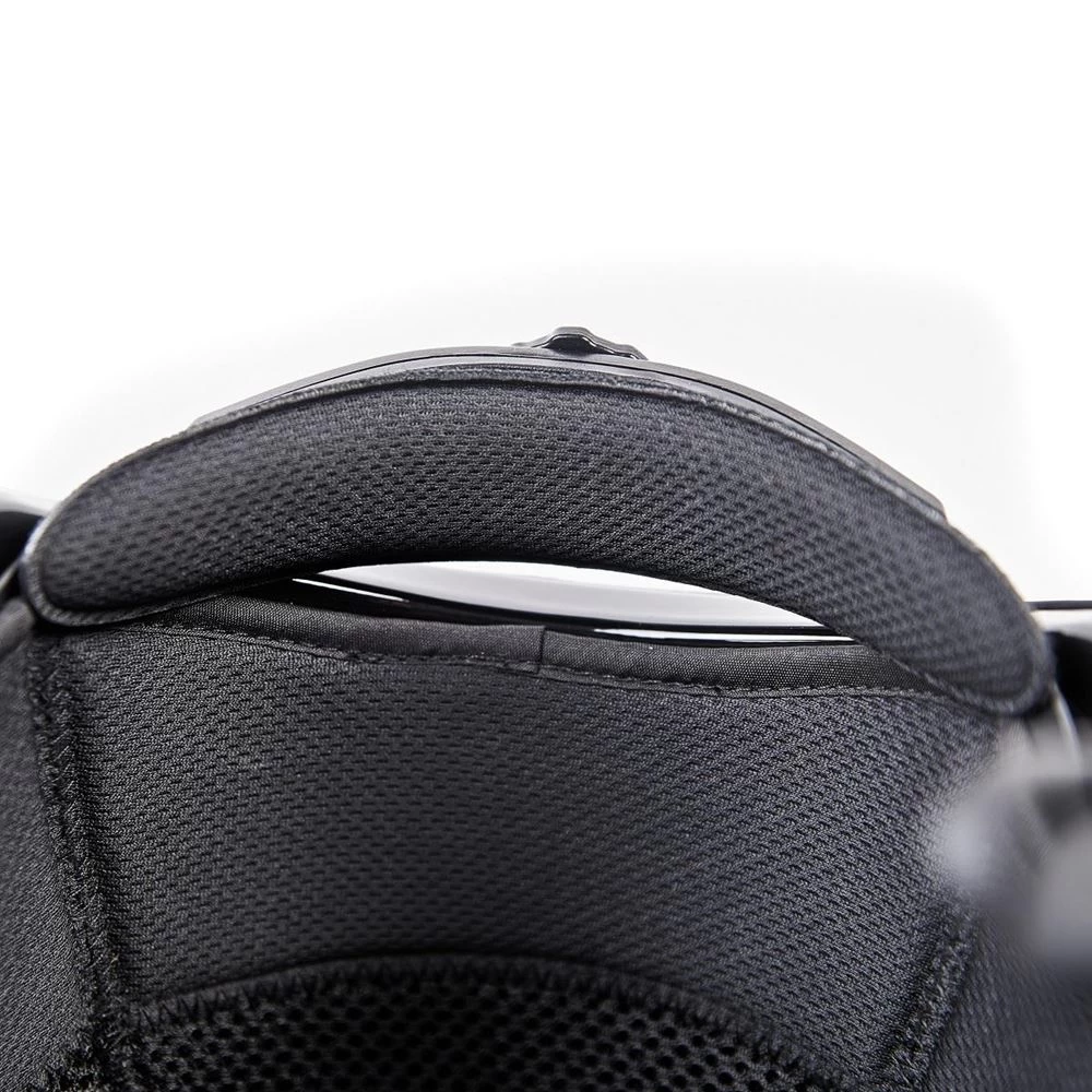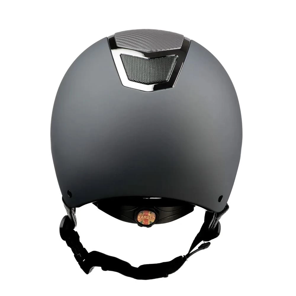 Chrome accents frame a central vented panel with a tough carbon finish. Low profile form. Smooth, lightweight outer shell. Neat and flattering flexible peak.